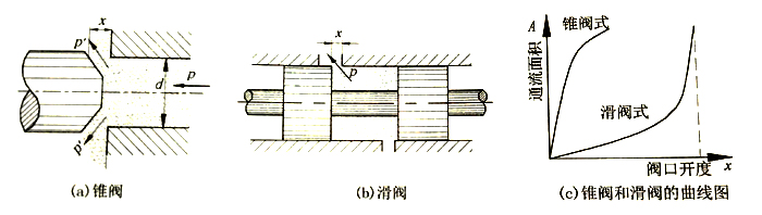按結(jié)構(gòu)形式分類有滑閥(或柱閥)、錐閥、球閥等,其中錐閥和滑閥是主要的結(jié)構(gòu)形式,應(yīng)用非常廣泛。錐閥的特點(diǎn)是具有良好的密封性,小開度時面積梯度dA/dx(x為閥口開度,A為閥口通流面積)比較大;滑閥的特點(diǎn)和錐閥相反。滑閥和錐閥的比較如圖5-1所示。