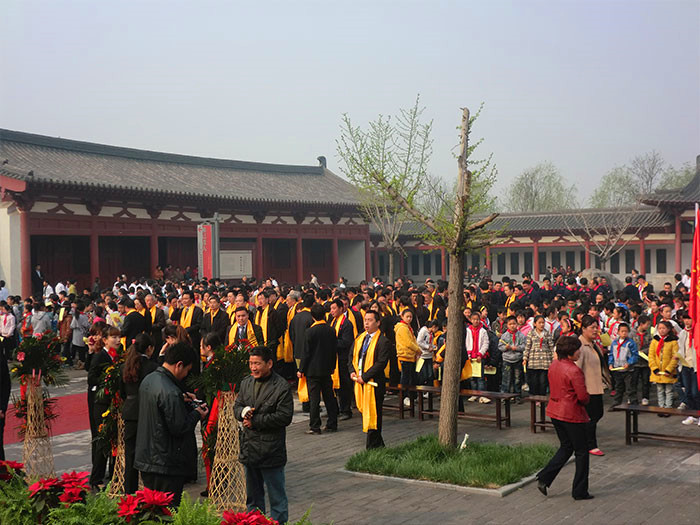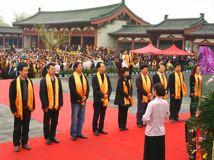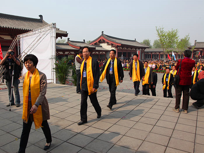 當天上午10時,現(xiàn)場頸批黃色綢帛的祭拜隊伍,聚集在杜甫故里詩圣堂前。震撼悠揚的古樂響徹行云。在敬獻花籃、誦讀祭文等環(huán)節(jié)后,祭拜者紛紛凈手、上香,向杜甫像三鞠躬,以表達對詩圣的深深敬意。